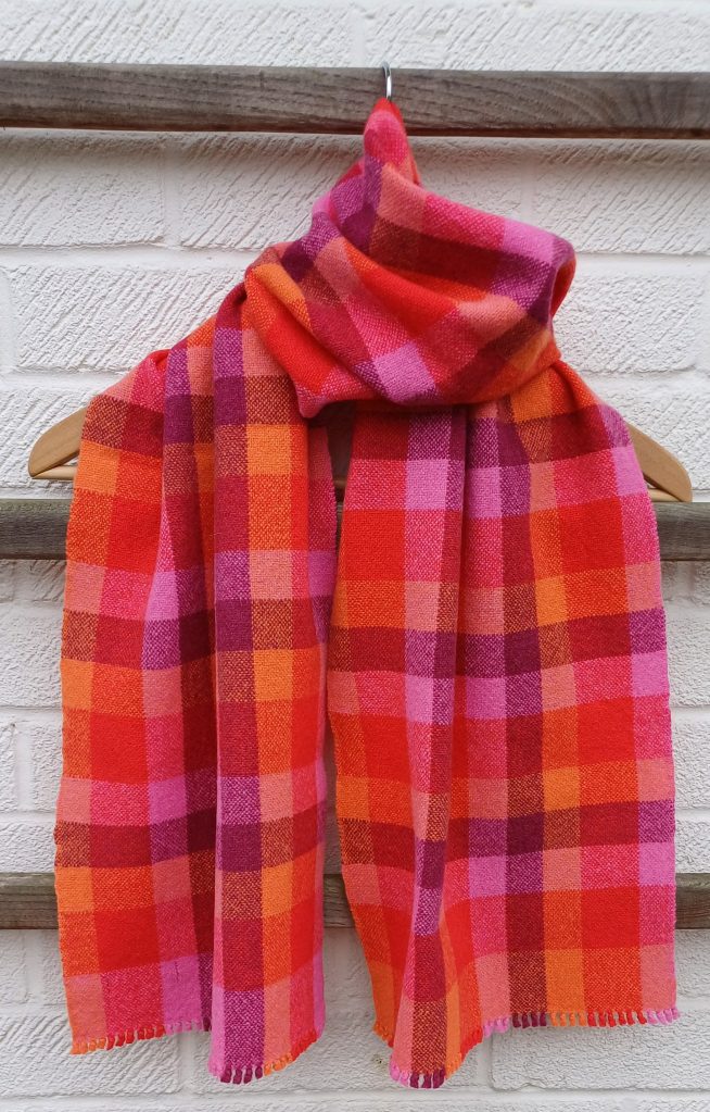 As I weave I need to be mindful of the pattern, colour changes and repeats of the weft so I can weave the fabric to match the design. Whilst weaving I also need to ensure the sett is correct which means checking the threads per inch on the weft at regular intervals. Weaving one of my standard woollen scarves takes around 3 hours.