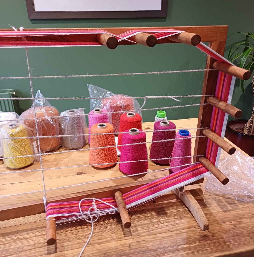 Having completed the design, I know the type of yarn, the number of warp threads and their length and I’m ready to start winding the warp. I do this using a warping frame where I hand wind each thread on the frame in the correct colour order for the pattern I’m weaving.