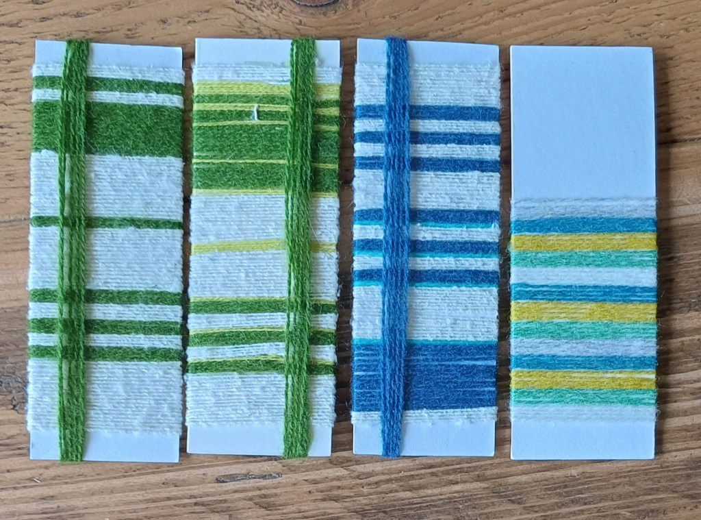 In this step I think about the fabric and it’s intended use, as that can suggest a weave structure and the sett of the fabric (how loose or tightly woven the fabric will be). During this phase techniques such as card-winds and sampling help to shape the final piece. Card winds allow me to pit colours together, swapping in and out different colours to find the right combination. Sampling requires the set up and use of a table loom, perhaps a couple of times or more before I find the right combinations of colour, sett and design. With the samples I always was as this can significantly change the appearance of the finished cloth and it also allows me to calculate the shrinkage which can be up to 20%.